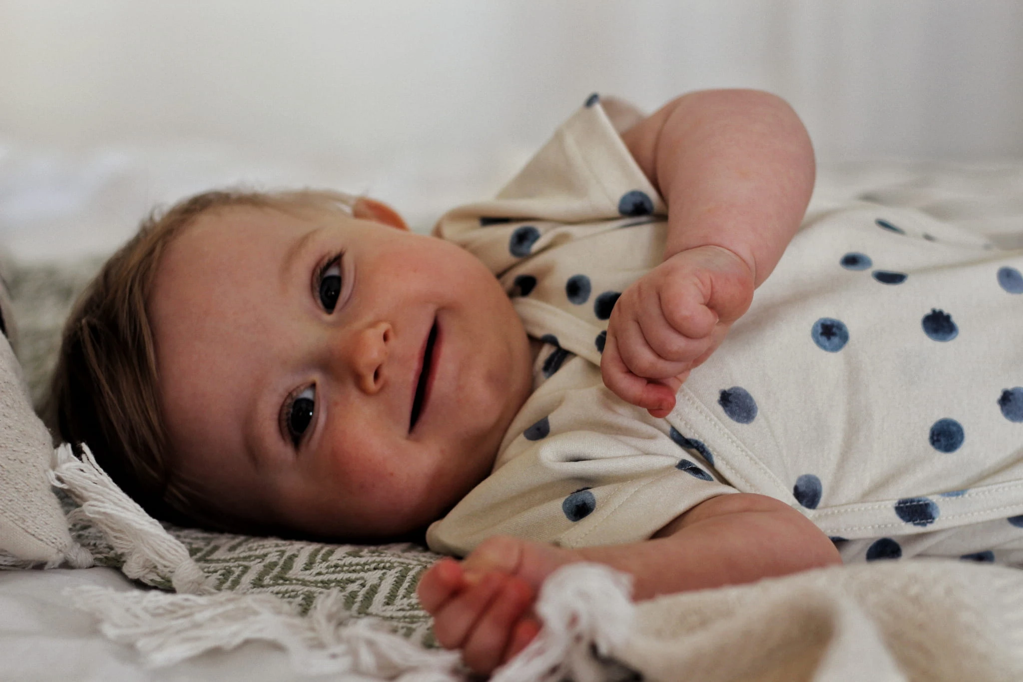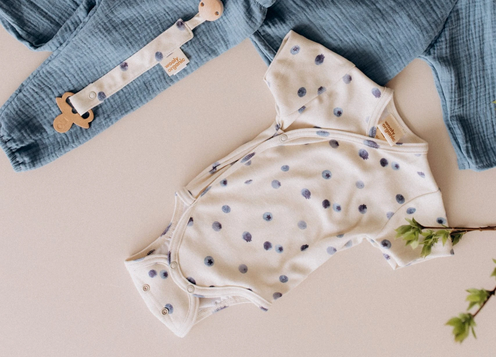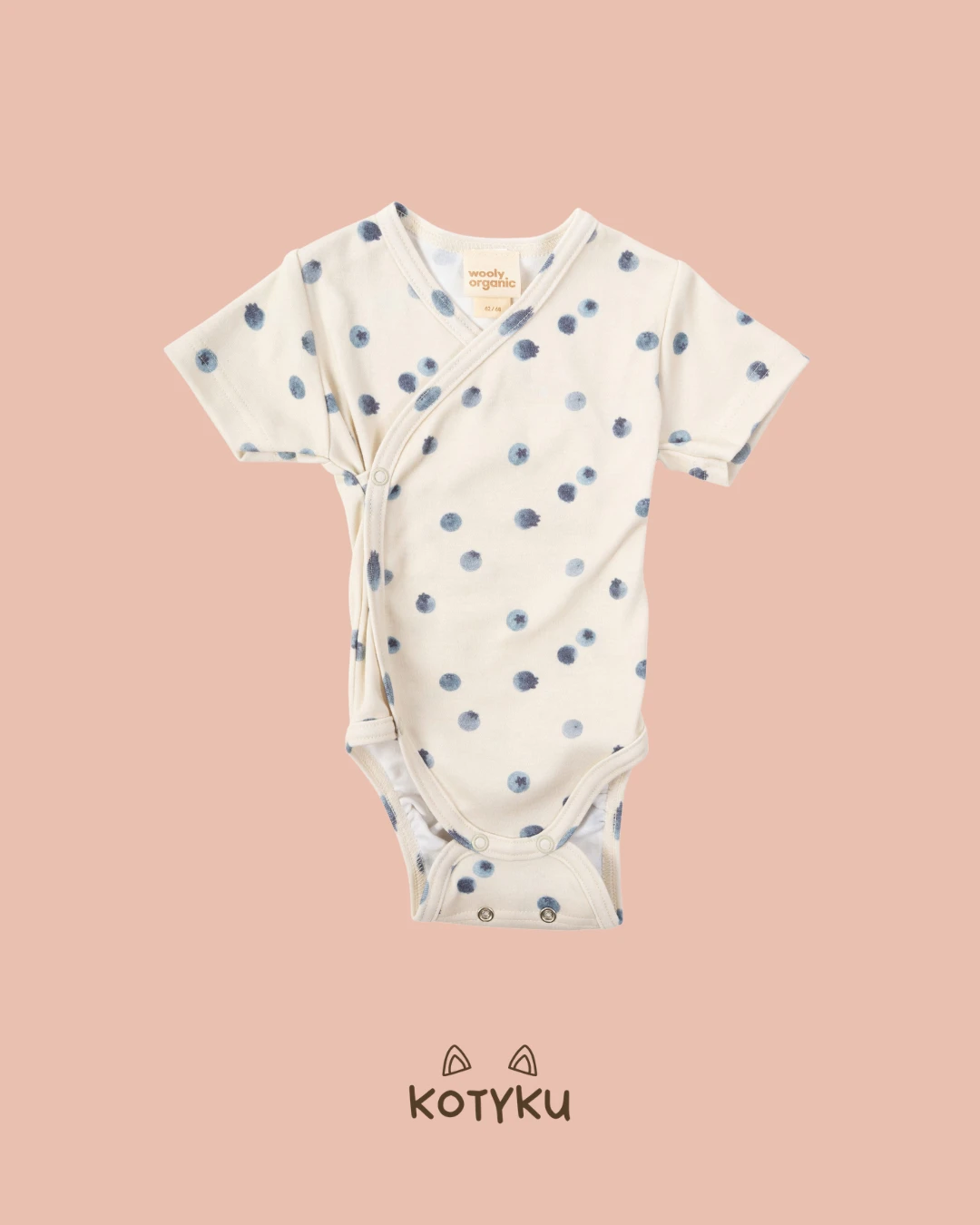 Kopertowy krój ułatwia ubieranie bez konieczności przekładania przez głowę, a krótkie rękawy sprawdzą się idealnie w cieplejsze dni lub jako warstwa pod inne ubranka. Subtelny, borówkowy print nadaje całości lekkości i naturalnego uroku.