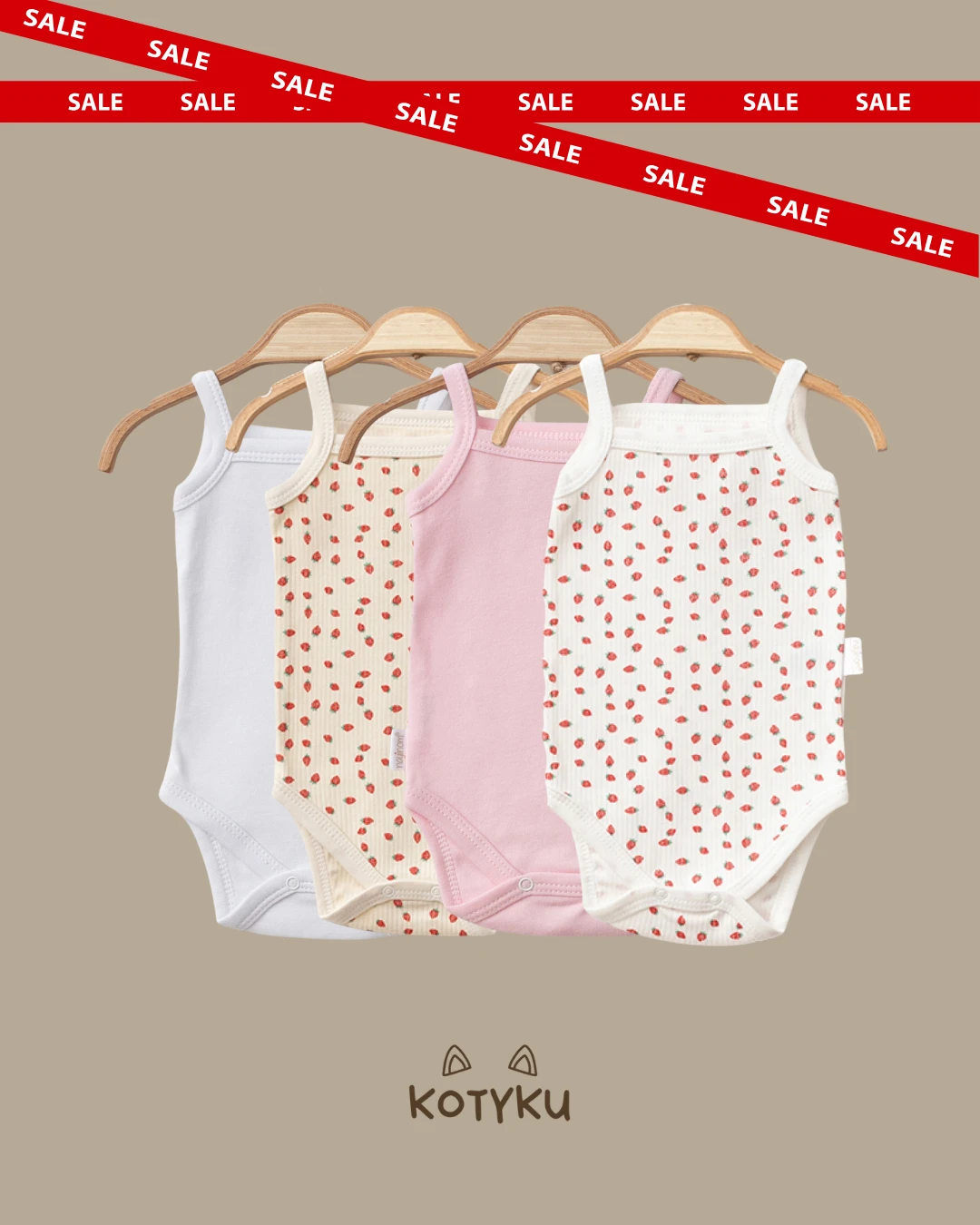 Zestaw 4 body z odkrytymi ramionami, wykonanych z miękkiej, przewiewnej bawełny, idealnych na cieplejsze dni. W komplecie znajdują się dwa prążkowane body w kolorach białym i kremowym z delikatnym nadrukiem poziomek – subtelnym, letnim akcentem – oraz dwa gładkie body w kolorze białym i jasnoróżowym.